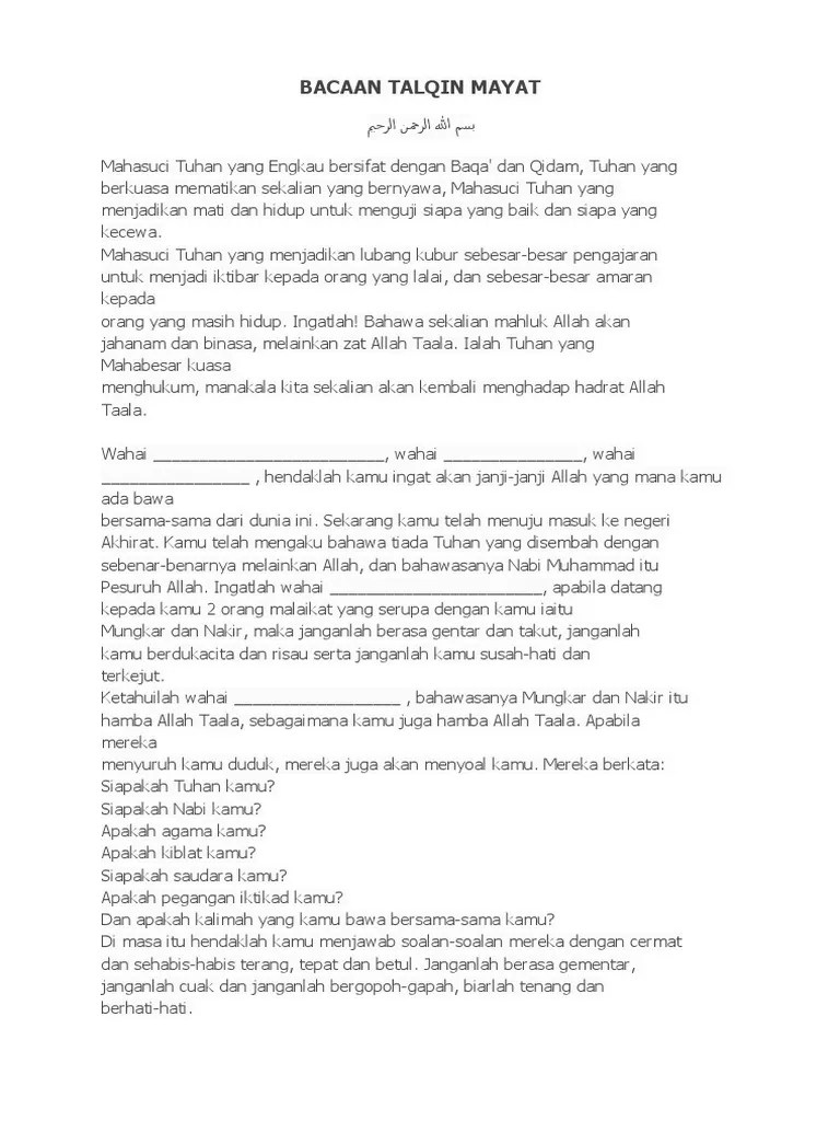 Compress a pdf file with free or professional tools Download as docx, pdf, txt or read online from scribd. Talkin untuk jenazah bismillahir rahmanir rahim. Sembahyang jenazah bacaan talkin syabab . Bacaan talkin dan doa lepaslah dan selesai tanggungjawab orang yang hidup terhadap mayat sebagai fardhu kifayah.